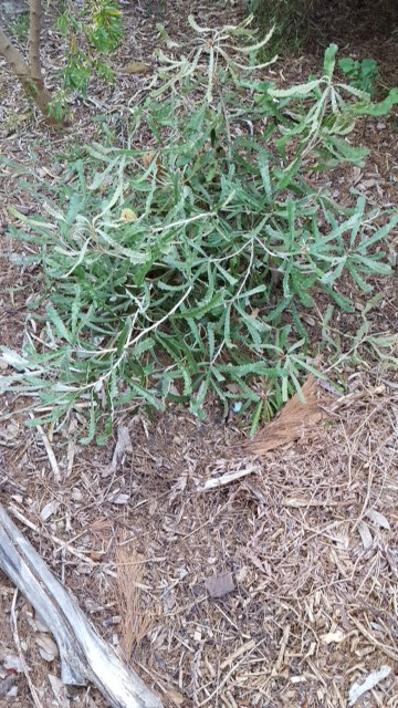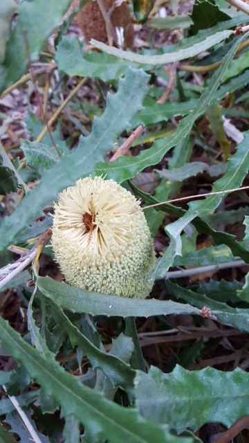 About 9 years ago I decided to have a Banksia garden. I bought things that might grow in my Mt Martha soil and cope with late frosts. Nothing happened flower-wise but everything is growing nicely. One in particular got to a size and stayed there. Upon reading my Banksia book it said it may take 10 years to flower in cultivation. Patience is a virtue. My Banksia Pilostylis has 3 flowers this year. They are green with a black eye.