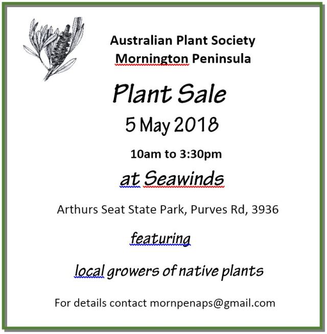As Karen and I will be away during the period from June to August I would appreciate anyone attending our excursions, planting/weeding days or our meetings to hear a guest speaker writing a brief report and/or sending me some photos for our web newsletter. Mark them Attention: Mark Allison and send to our email address – mornpenaps@gmail.com