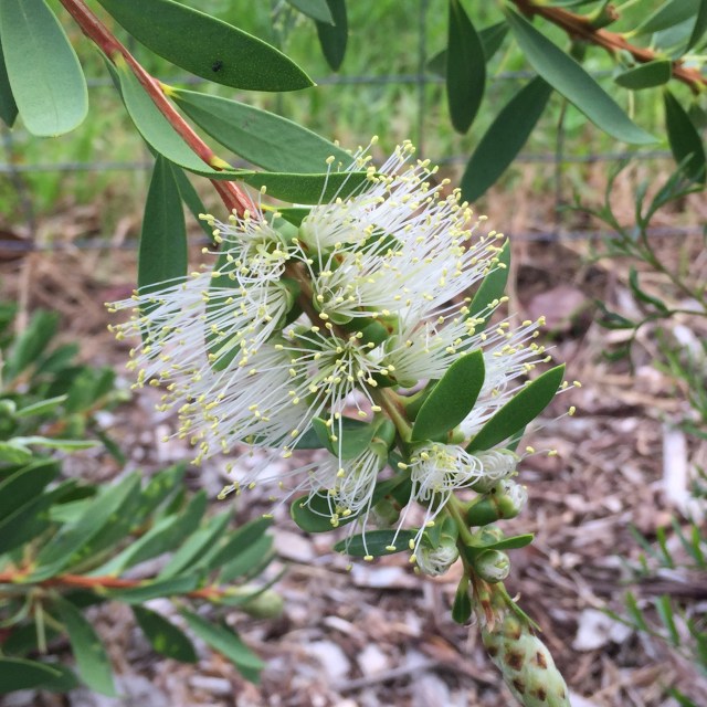 A more than suitable plant flowering in our garden presently is a Callistemon Anzac White. It doesn’t mind the slightly clay conditions. This is its second year in our garden and it has delicate white bottlebrushes. Sadly they are soon gone when the wind blows. The plant is spreading horizontally well but we are waiting for a bit of vertical growth as it could reach a metre and a half in height whilst having the potential to spread out as far as three metres wide.
