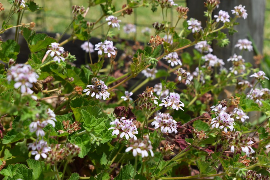 Our native Pelargonium was in flower during February and is Plant of the Month. It is perennial in nature and after a good cutback each flowering season comes back well. Karen’s bees enjoy it too.