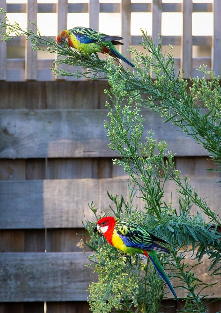 In Rosebud Verena Reich had Eastern Rosellas enjoying a feed. This is what happens when the weeds get away from you (the plant is Fleabane).