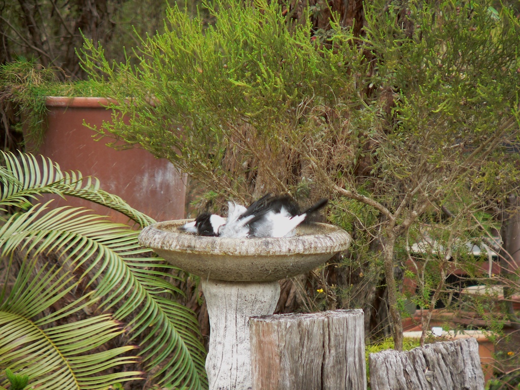 Ray and Eva Turner had visitors of the feathery kind over the summer also. The yellow tailed black cockatoos were helping themselves to a feed and a magpie enjoyed a bath instead of taking a drink.