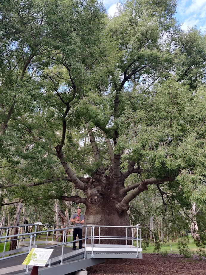 You will quickly realise that Karen and I do not have one of these growing in our garden. However after seeing amazing Boab trees (Adansonia gregorii) in Western Australia a few years ago we were equally impressed to find similar looking bottle trees whilst visiting Roma whilst up in Queensland in our caravan. They may look similar but aren’t related. Here I am standing in front of the Largest Bottle Tree in Roma, a massive specimen of Brachychiton rupestris which stands at 15m high. It has a girth of 9.62 metres and the crown measures 23 m.