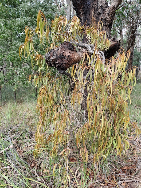 As we turned left along the creek line the vegetation changed and there were many more sightings of Mistletoe high up in the trees. This was the other one we hoped to find, Amyema pendula ssp.pendula, some of the plants were very large, showing great age, with huge central burls. The birdlife flitting about was also as we had been told to expect, tree creepers and brown headed honeyeaters.