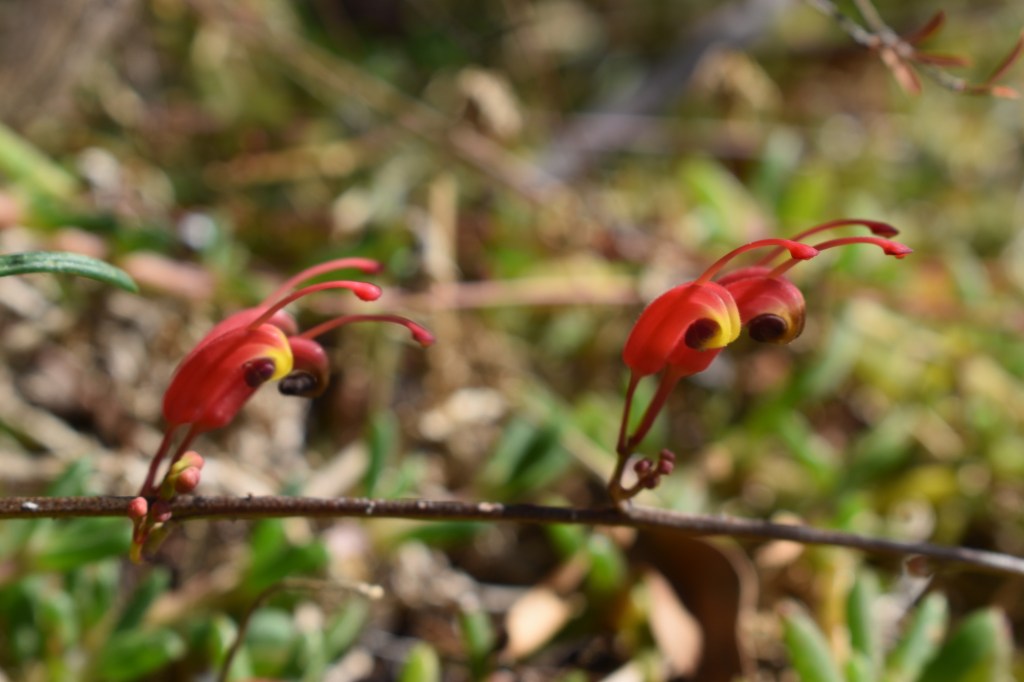 Plant of the Month for April in our garden was our well spread but sparse Grevillea nudiflora groundcover with it’s lovely yellow-red flowers.