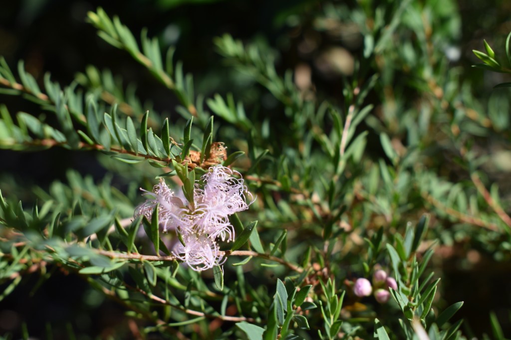 It may be small, less than 40 cms in height but we are always happy to have this Melaleuca thymifolia in bloom. It’s not as bright a pink as some you see in the nurseries but it is quite lovely I think.