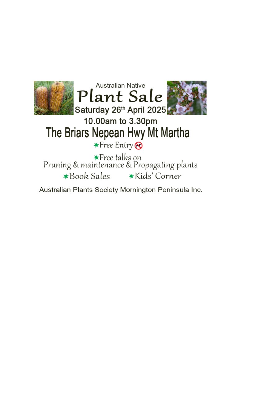 APS Mornington Peninsula Annual Plant Sale On April 8, 2025April 8, 2025 By APS Mornington PeninsulaIn Australian gardening Share this: Click to share on X (Opens in new window) X Click to share on Facebook (Opens in new window) Facebook Like Loading... Related