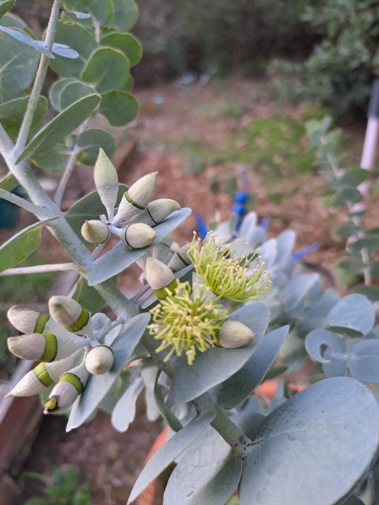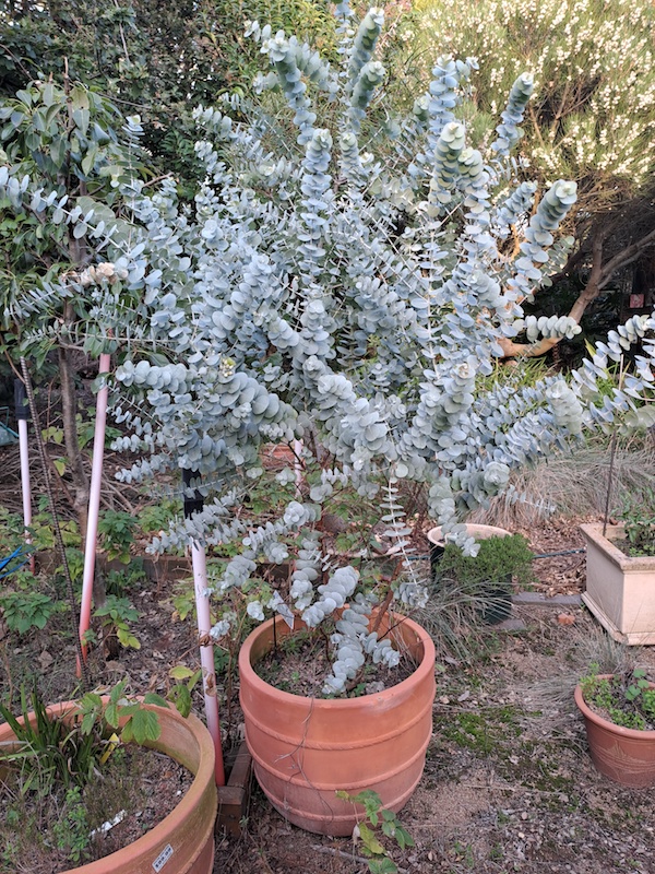Our leader Robyn Tyson is either running out of room or knows it’s better to try growing certain plants in pots. She has sent me these photos of her Eucalyptus kruseana which can be found in her micro climate pot area. It has been in 2 years, is a small mallee from W.A., and is getting a nice trunk happening and the first flowers. A lovely choice for May Plant of the Month.