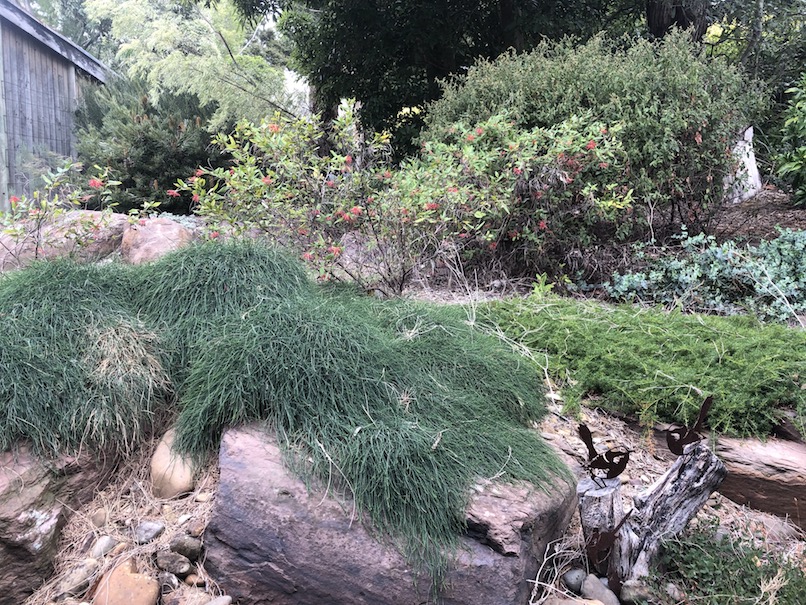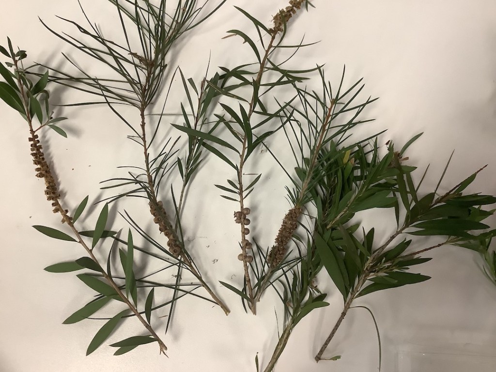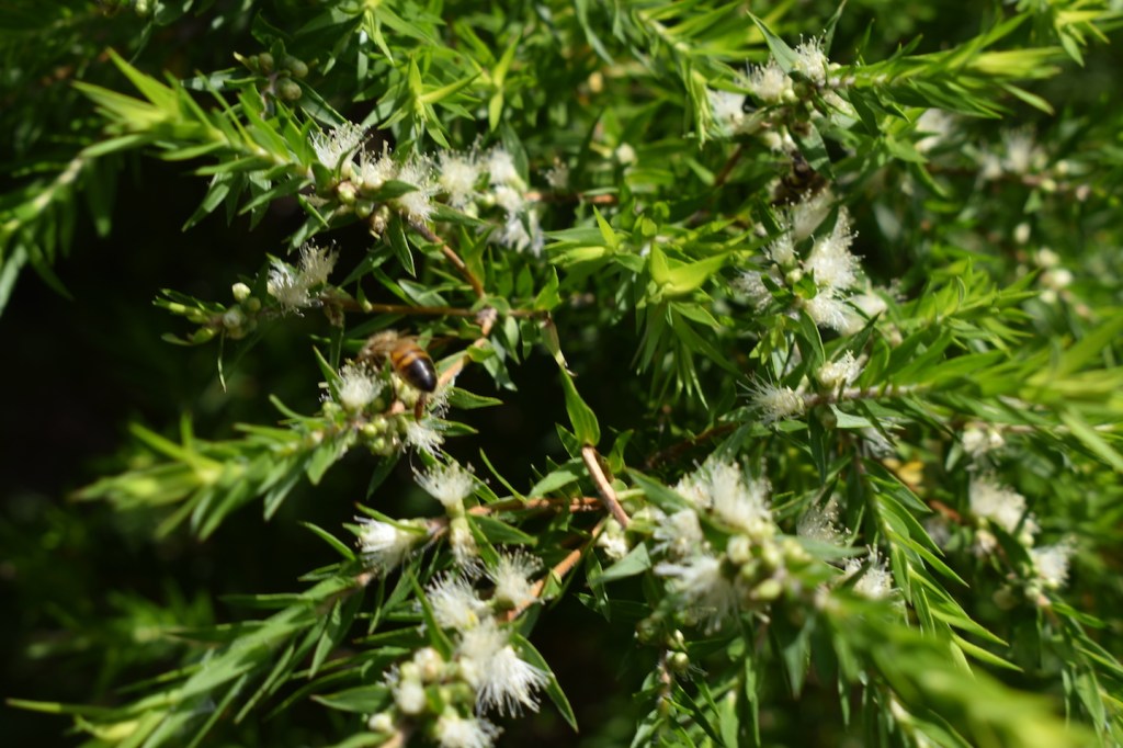 Even though our Melaleuca bracteata “Revolution Green’ had very small flowers it attracted the bees well in January. It is in heavy clay soil . Much of the day it is in shade but it handles the hot westerly sun at the end of the day. This year it has had a growth spurt and was covered in small white flowers.