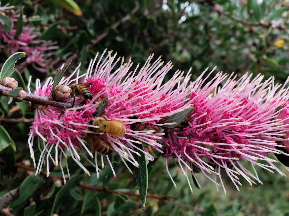 Our Hakea ‘Burrendong Beauty’ always lives up to its name each year. We love it and so do the bees. It has now more than matched the suggested 1.5m high, 3m wide guide on the tag (and the garden bed we have it growing in) and we have to prune it so we can make our way down our path.