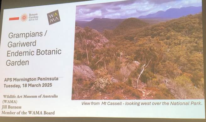 Our March 20th speaker was Jill Burness who spoke about her involvement with the Wildlife Art Museum of Australia and the closely related Gariwerd Endemic Botanic Garden in the Grampians. She focused on the work done by volunteers to help create and maintain the garden which was started in 2019. APS Victoria and Cranbourne RBGV have also helped with seed and plant donations after bushfires wiped out their plant supply in Pomonal. Stage 1 of the gardens had 540 plants of 56 species. The Art Museum was completed last year and will be officially opened soon. Worth visiting if you’re are in the area.