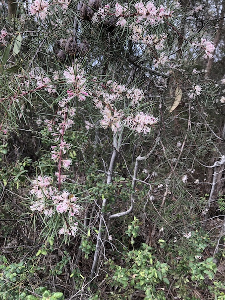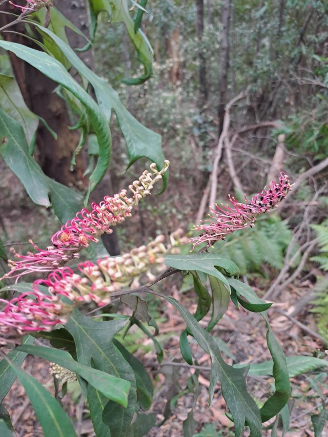 Our next stop was to look at Grevillea Barklyana, that is endangered as it only grows here along the creek line. At present they are only saplings, after regeneration from several bushfires,but become quite tall trees, they have Oak like leaves and long pink toothbrush flowers.