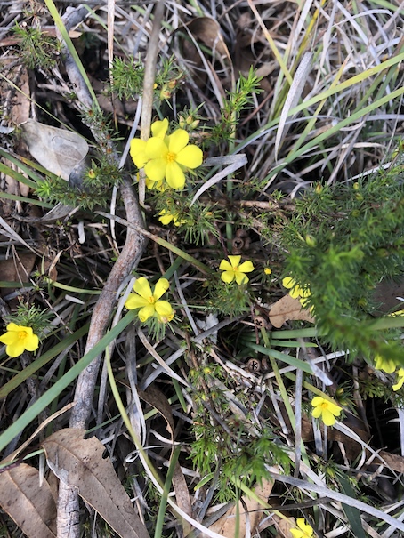 Some Drosera, Nodding Green Hood Orchids and Hibbertia at ground level.
